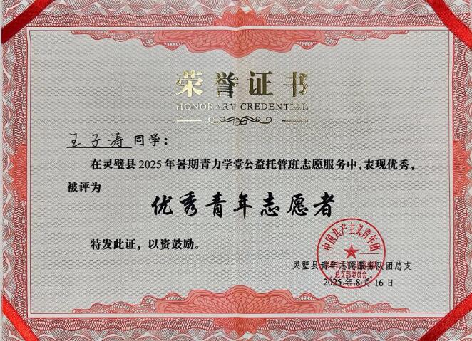 本网讯(信息技术学院 孙颖凯)为深入学习贯彻习近平新时代中国特色社会主义思想,积极落实“时代新人铸魂工程”,引导广大学生在社会实践中厚植家国情怀、增长知识才干,7月至8月,信息技术学院团总支精心组织了“三下乡”大学生暑期社会实践系列活动。其间,2024级人工智能技术应用专业1班班长兼副团支书王子涛凭借突出表现,荣获宿州市灵璧县及灵璧县志愿服务总队联合授予的2025年大学生暑期社会实践“优秀青年志愿者”称号。